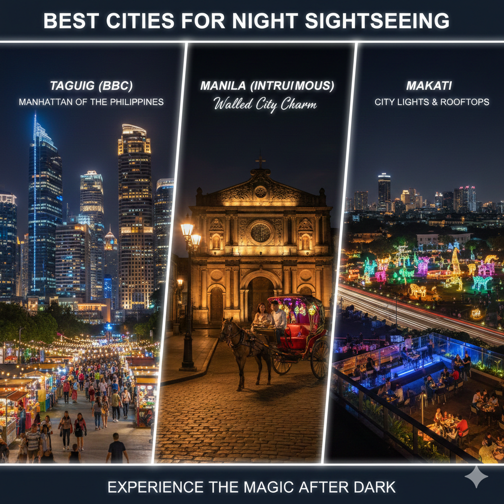 • Manila (Intramuros): The Spanish walled city has a nostalgic and romantic ambiance during night hours with horse-drawn carriages and lighted cathedrals.