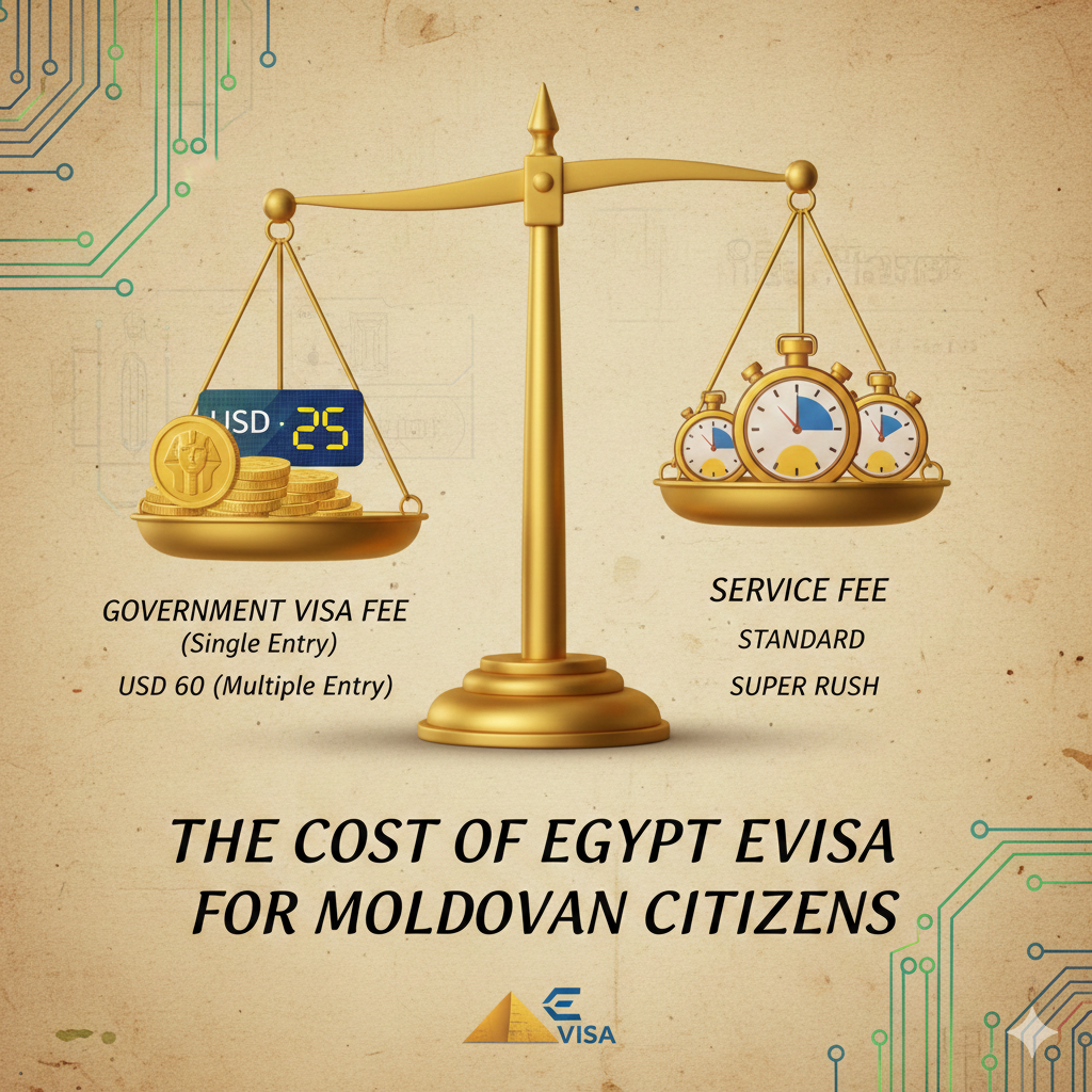 The Cost of Egypt eVisa consists of the government visa fee and a service fee for processing. For Moldovan citizens, the government fee for a Single Entry Visa is USD 25, while a Multiple Entry Visa is USD 60. The final price will vary based on the processing speed (Standard, Rush, or Super Rush) you select at the time of application.