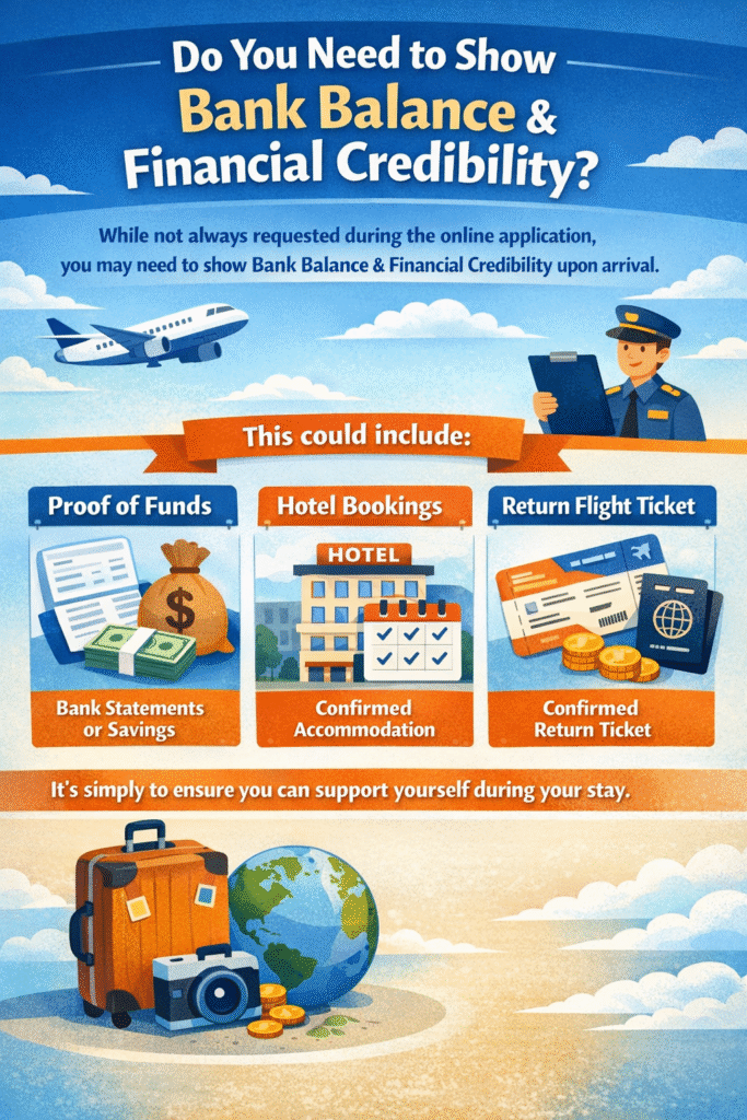 While not always requested during the online application, you may need to show Bank Balance & Financial Credibility upon arrival.