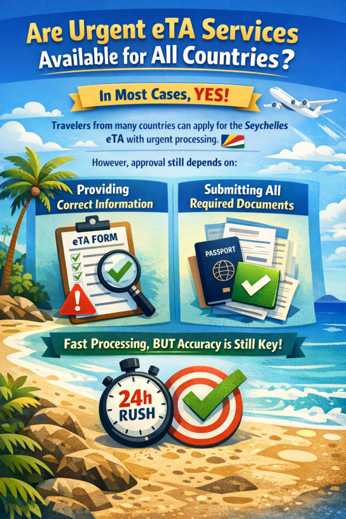 Travel doesn’t always go according to plan. Maybe you booked a spontaneous trip, got called for an urgent meeting, or simply forgot to apply on time. Whatever the reason, Seychelles Urgent eTA Services are designed to help you travel without stress—especially when heading to Seychelles.
